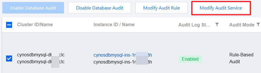 | 本インターフェース(ModifyAuditService)は、クラウドデータベース監査ログの保存期間、監査ルールなどのサービス設定を変更するために使用されます。 |