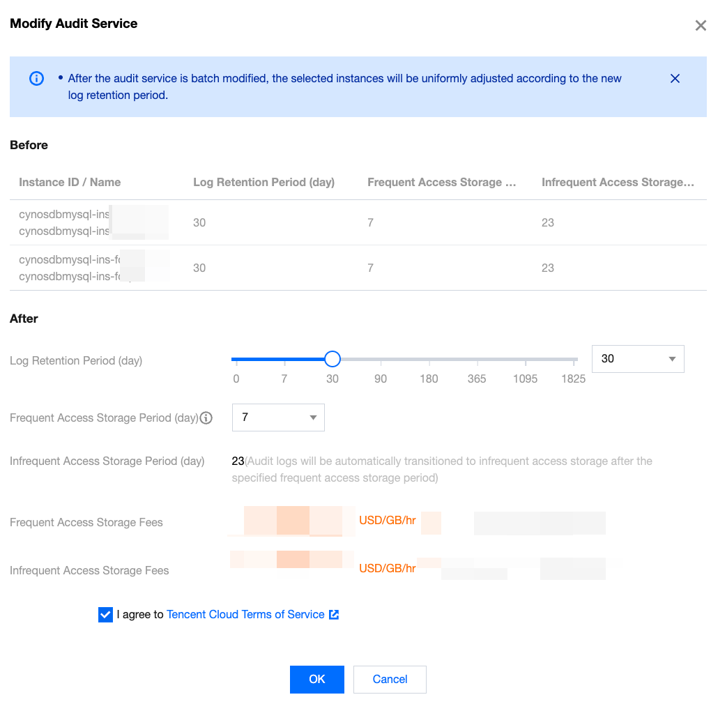 比較の便宜のために、バッチ監査サービス変更ウィンドウでは変更前後のログ保存期間を表示します。変更後、選択したインスタンスは一斉に新しいログ保存期間に基づいて調整を開始しますので、誤りがないことを確認してから変更を行ってください。