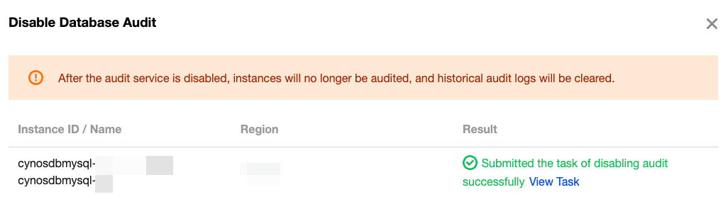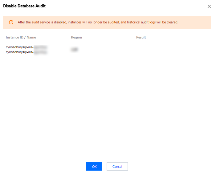 監査サービスを停止すると、インスタンスに対する監査が停止され、過去の監査ログはクリアされます。