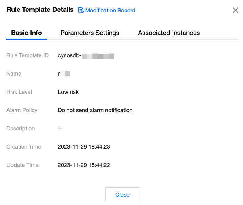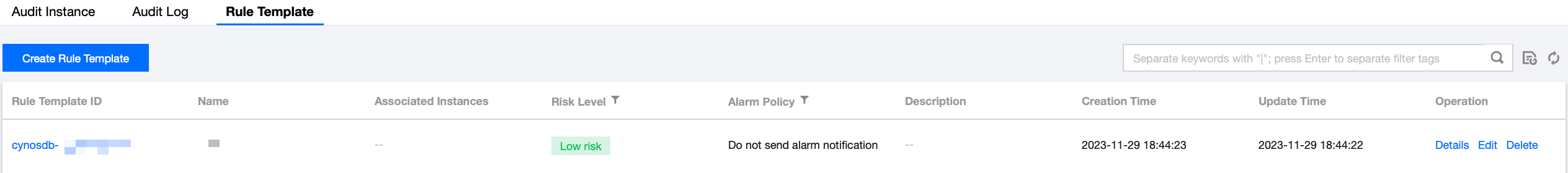 関連付けインスタンス | 対応するルールテンプレートにバインドされたインスタンス数を表示します。インスタンス数をクリックすると、関連付けインスタンスの詳細情報(インスタンスID、監査タイプなど)が表示できます。 |