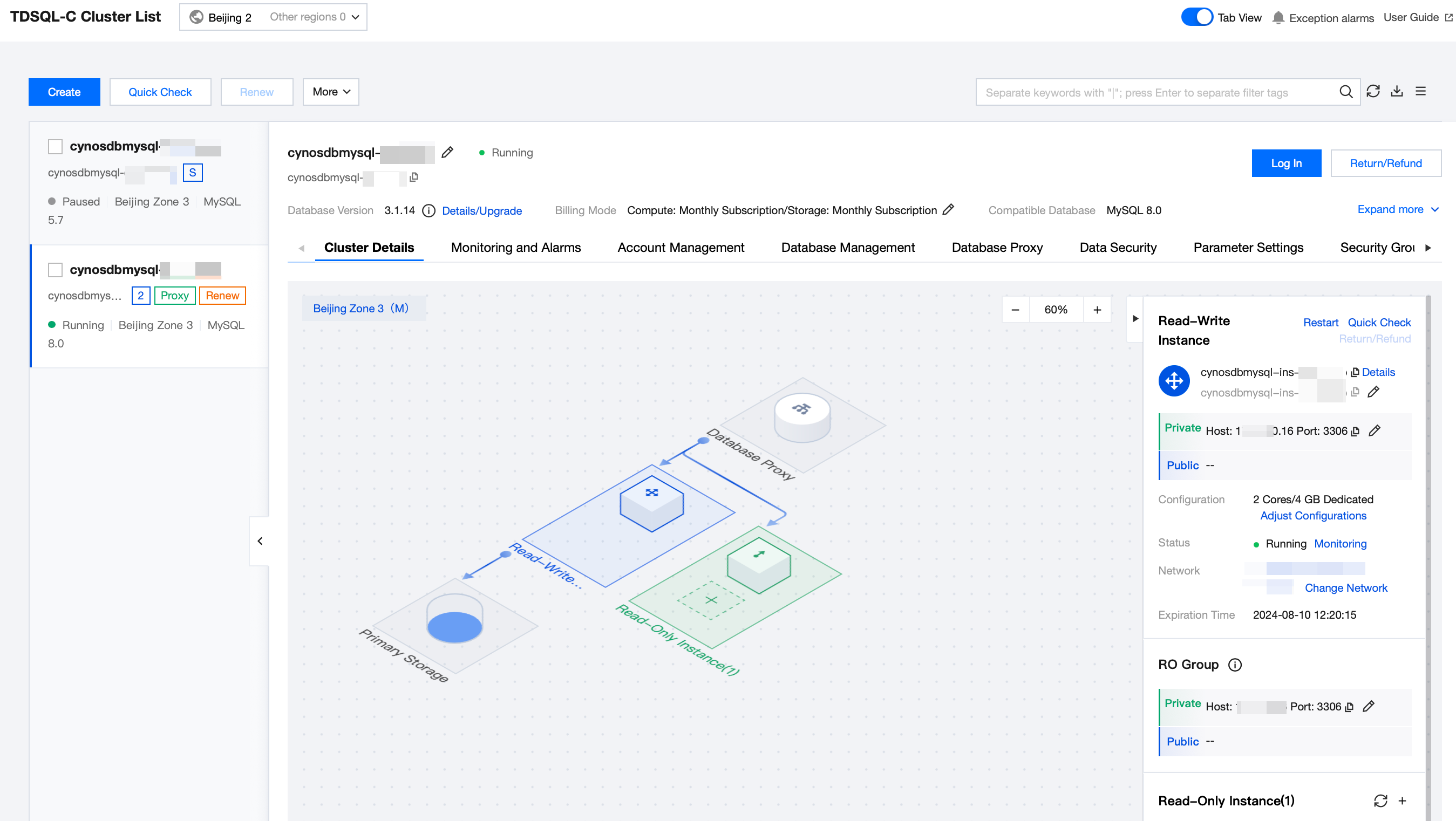 5. クラスタ詳細ページでは、TDSQL-C for MySQLのクラスタアーキテクチャとストレージの詳細を確認でき、インスタンスに対する関連操作が可能です。詳細な操作についてはインスタンス管理概要を参照してください。 6. リストビューに切り替える必要がある場合は、コンソールの右上でタブビューをオフにすることができます。