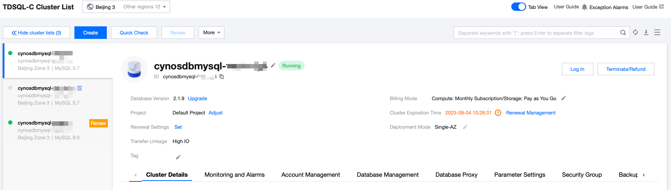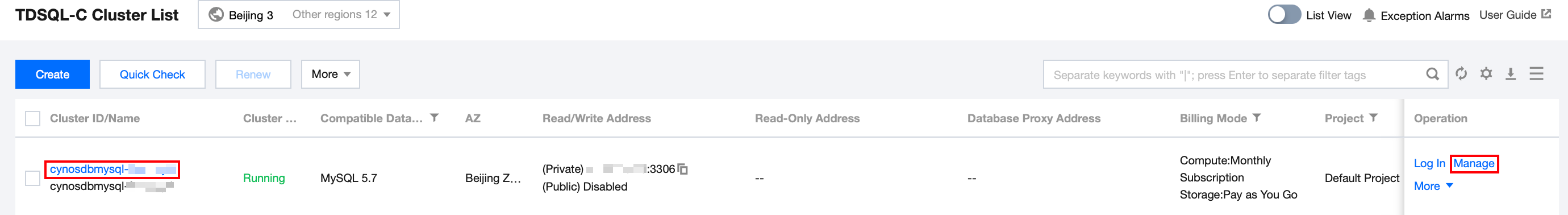 左側のクラスタリストでターゲットクラスタを見つけ、クラスタIDまたは操作列の管理をクリックすると、クラスタ管理ページに移動します。