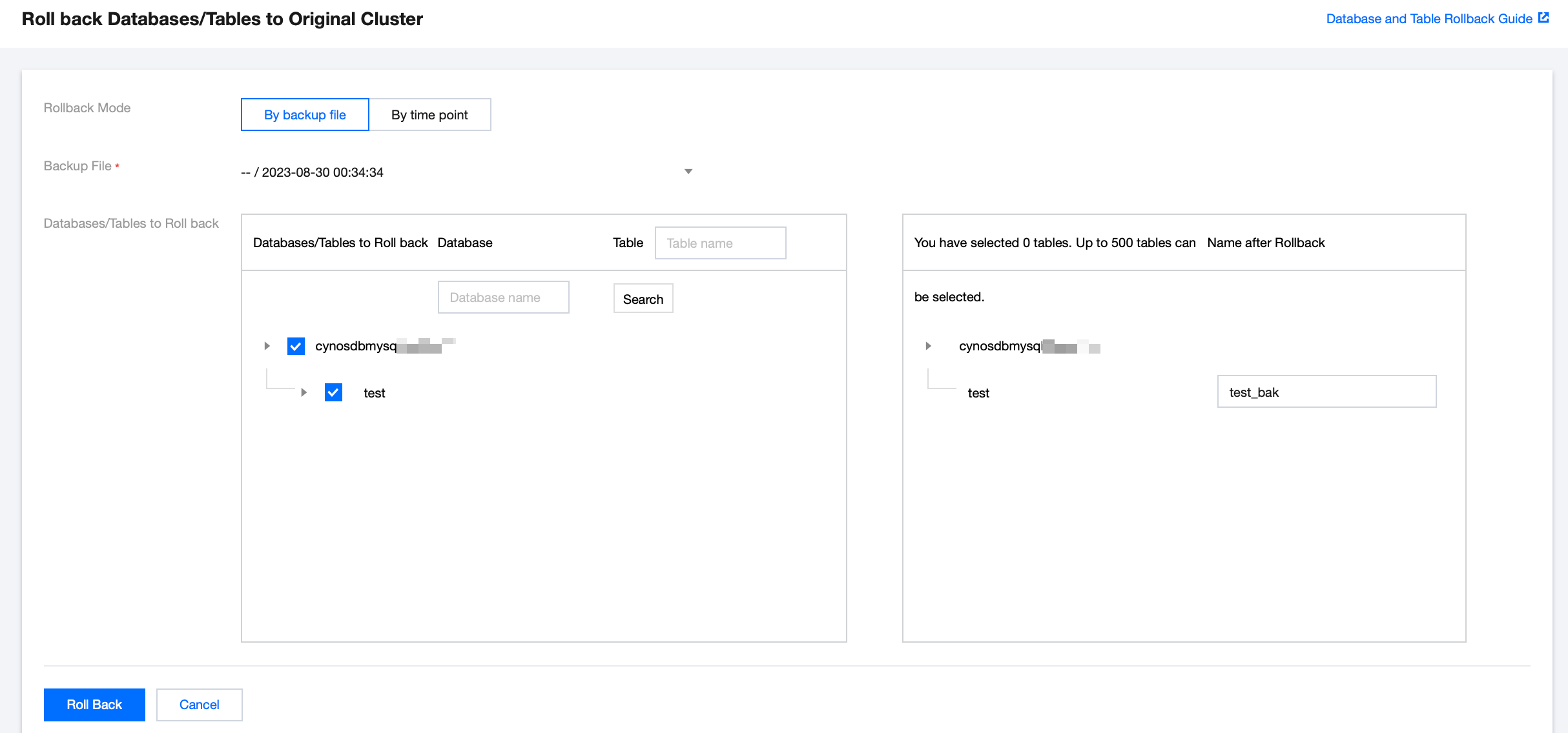 1回の操作で最大500のデータベースまたはテーブルをリストアできます。