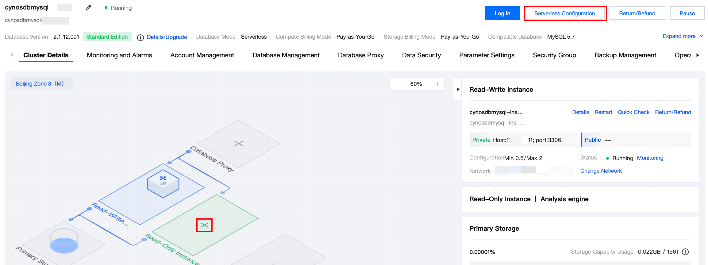 3. クラスタ管理ページで、トポロジ図の読み取り専用インスタンスエリアにある"+"アイコンをクリックするか、または右上のServerless 設定をクリックします。