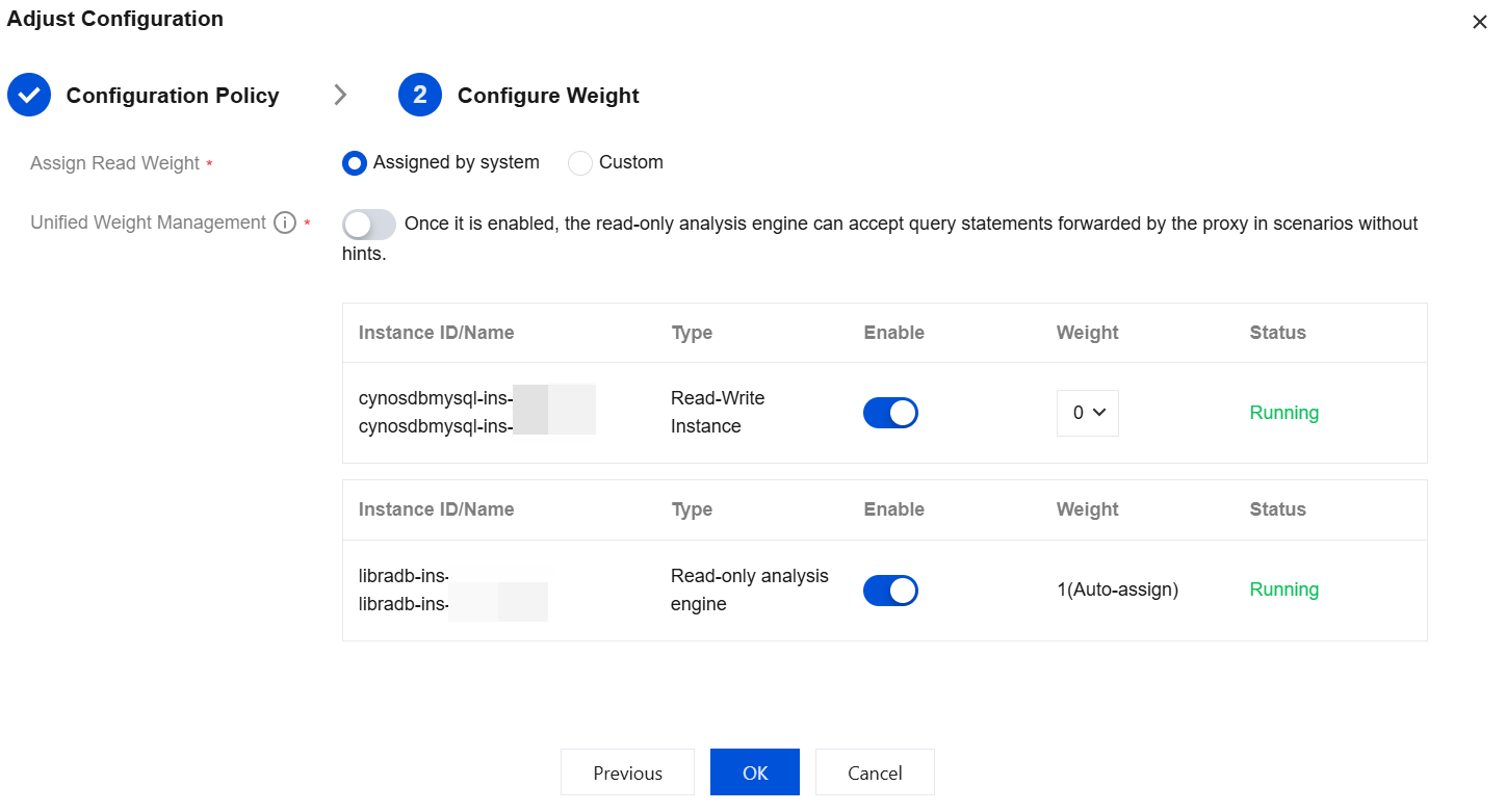 リードウェイト割り当て | データベースプロキシは読み取りリクエストを異なるインスタンスに分散する必要があります。各インスタンスに異なるリードウェイトを割り当てることで、データベースプロキシはインスタンスのウェイト値に基づいてリクエストのルーティング先を決定します。ここではシステムによる自動割り当てまたはカスタム設定を選択できます。カスタム割り当てを選択した場合、異なるインスタンスのデータベースアクセスウェイトを個別に設定可能です。以下はリードウェイト割り当て時の有効化とウェイト設定に関する説明です: 有効にする:有効にするボタンをオンにすると、選択したインスタンスに接続が割り当てられます。有効にするボタンをオフにすると、選択したインスタンスには接続が割り当てられません。 ウェイト:ウェイト値の範囲は0~100です。0に設定すると、選択したインスタンスに接続が割り当てられ、最小のウェイトとなります。数値が大きいほどウェイトが高くなり、より多くの読み取りリクエストを受信できます。リードウェイト割り当てを設定すると、読み取りリクエストは対応するインスタンスに比例的にルーティングされます。例えば、インスタンス1、インスタンス2、インスタンス3にそれぞれ3、2、1のリードウェイト値を割り当てた場合、データベースプロキシ接続アドレスからの読み取りリクエストは3:2:1の割合で各インスタンスにルーティングされます。 説明: ここのウェイトは、読取リクエスト(非トランザクション)向けウェイトの割り当て戦略です。 ウェイト設定操作は接続の瞬断を引き起こしません。 無効に設定すると一部の接続に影響が生じる可能性があります。影響を回避する場合は、まず該当するインスタンス/ノードのリードウェイトを0に調整し、その後で無効に設定することを推奨します。 ウェイト設定は新規接続に対してのみ有効になります。既に確立されているデータ接続には適用されません。 読み取り専用分析エンジンのウェイト説明 データベースプロキシに読み取り専用分析エンジンが含まれている場合、デフォルトではHintが指定されていないSQLは読み取り専用分析エンジンに送信されません。複数の読み取り専用分析エンジンが存在する場合にのみ、読み取り専用分析エンジンのウェイト設定が有効になります。 注意: バージョン1.4.5のデータベースプロキシでのみ、読み取り専用分析エンジンのウェイト設定がサポートされます。 |