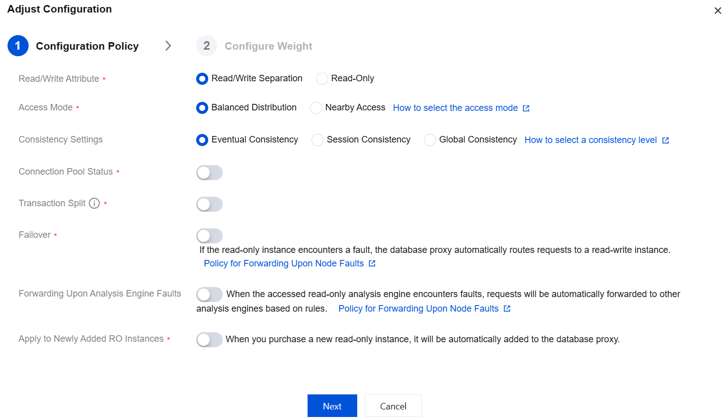 自動で読み取り専用インスタンスを追加する | 設定項目を有効にするかどうかを選択します。有効にした場合、新しい読み取り専用インスタンスを購入すると、データベースプロキシに自動的に追加されます。 リードウェイトがシステムによる自動割り当ての場合、新規購入した読み取り専用インスタンスには仕様サイズに基づいてデフォルトウェイトが割り当てられます。 リードウェイトがカスタム設定の場合、新規購入した読み取り専用インスタンスのデフォルト追加時ウェイトは0です。データベースプロキシページの接続アドレス配下で構成調整を行うことで変更可能です。 |