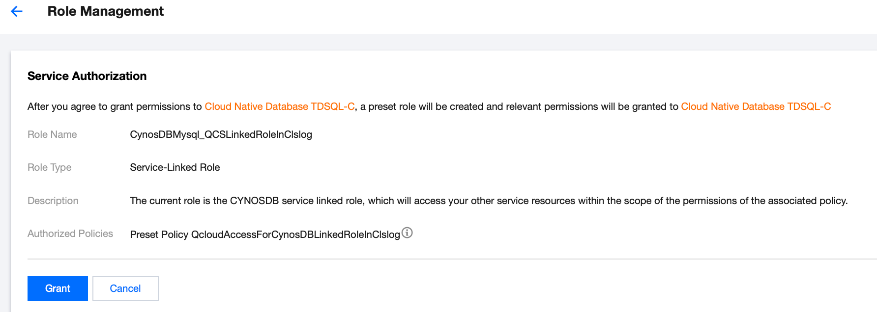 3. 配信サービスを開通ポップアップウィンドウで、開通へ進むをクリックし、TDSQL-Cにサービスロールの権限付与を行います(すでに権限付与が完了している場合は、ステップ3~5をスキップできます)。