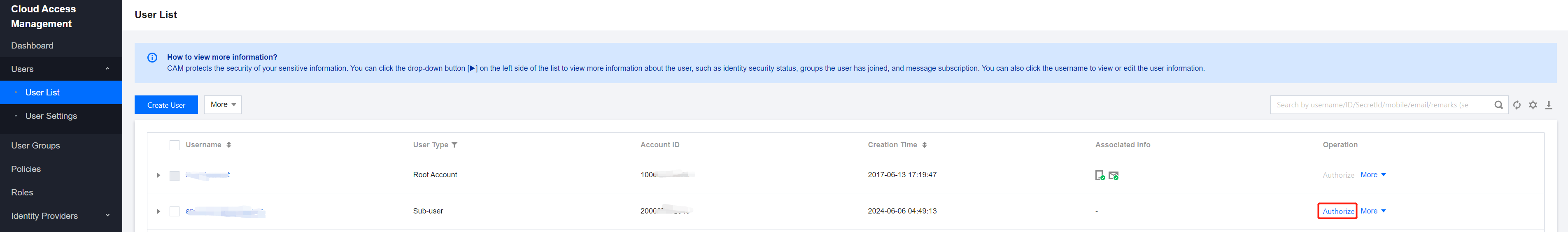 サブユーザーに権限を付与するには、メインアカウントでCAMコンソールにログインする必要があります。事前に対応するメインアカウントの所有者に連絡し、権限付与操作の支援を依頼してください。