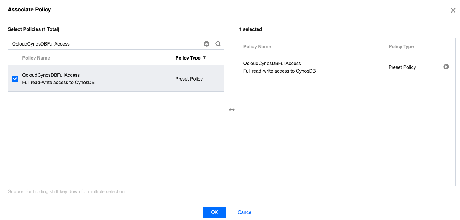 QcloudCynosDBFullAccess | クラウドデータベース TDSQL-C(CynosDB)のフル読み書きアクセス権限を付与されたサブユーザーは、メインアカウント配下に存在するTDSQL-C for MySQLクラスタを表示でき、かつクラスタに対するフル読み書きアクセス権限を持ちます。 |