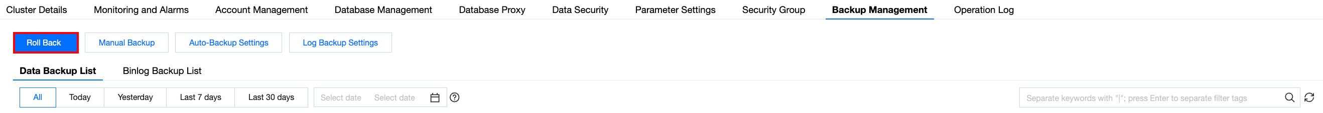 1. TDSQL-C for MySQLコンソールにログインし、クラスタリストでクラスタIDをクリックして、クラスタ管理ページに遷移します。 2. クラスタ管理ページで、バックアップ管理ページを選択し、リストアをクリックします。
