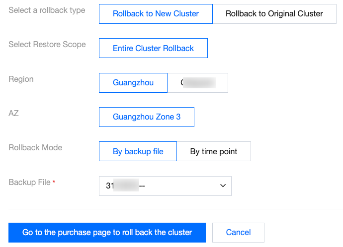 リージョン | 新しいクラスタのリージョンを選択します。元のクラスタが存在するリージョンで新しいクラスタを作成する選択をサポートし、またクロスリージョンで新しいクラスタを作成する選択もサポートします。クロスリージョンの選択範囲は、お客様のクラスタに存在するクロスリージョンバックアップファイルによって決定されます。クロスリージョンバックアップについて詳しくは、クロスリージョンバックアップをご参照ください。 |