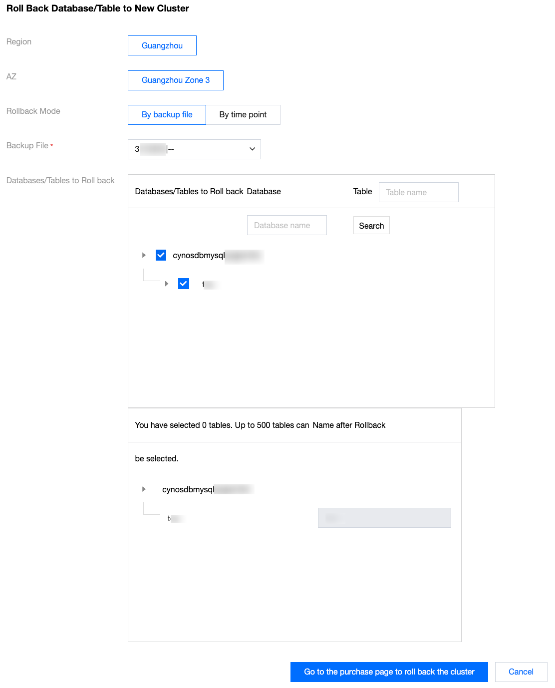 リストア対象のライブラリとテーブルを選択する | 復元対象の具体的なデータベースまたはテーブルを選択します。リストア後はデフォルトで元のデータベース/テーブル名で命名されます。 |