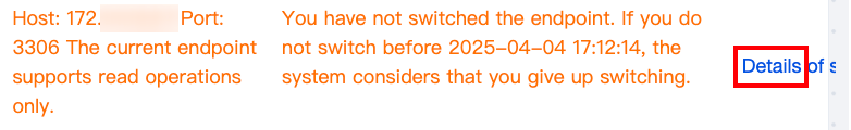 8. クラスタ詳細 > 読み書きインスタンス > 読み書きアドレスの後、切替詳細をクリックします。システムが提示した時間内に切替を完了する必要があります。そうしない場合、切替を放棄したとみなされます。