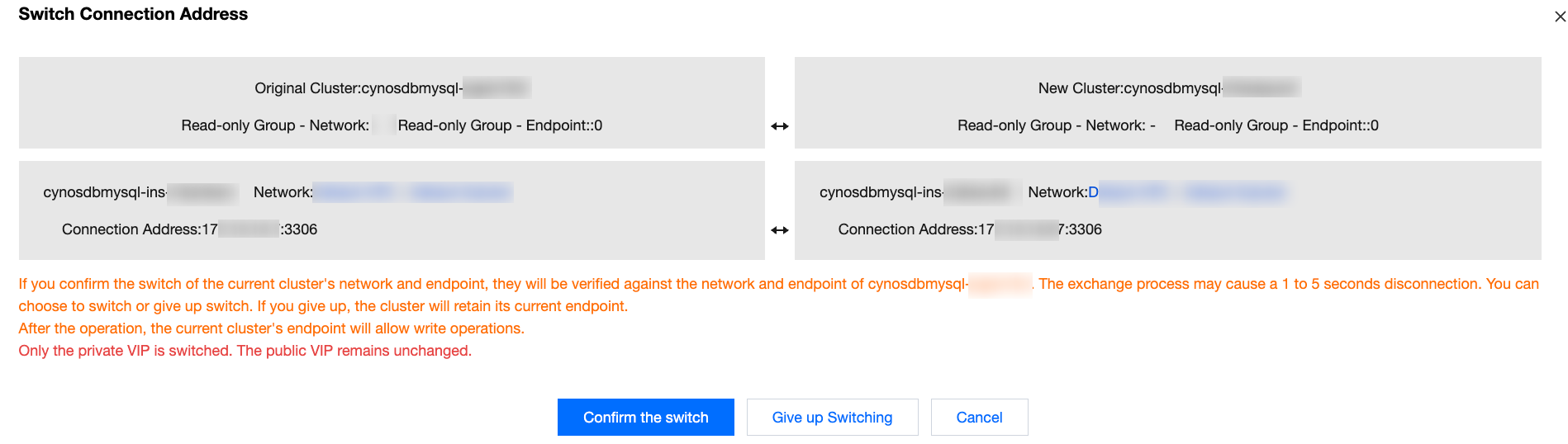 確認切替:確認切替をクリックすると、元のクラスタとの接続が中断されます。この過程で1~5秒の瞬断が発生し、元のクラスタと新クラスタはVIPアドレスを交換します。