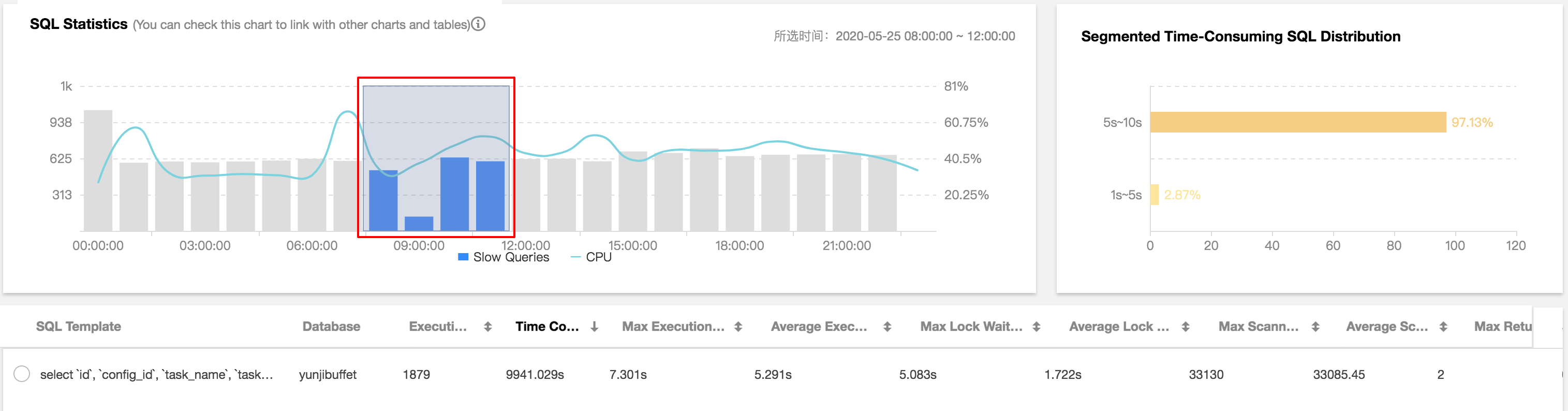 スロークエリ現象が発生するとき、一般的に、複数の監視指標が同時に急上昇します。例えば:CPU使用率、スロークエリ数。