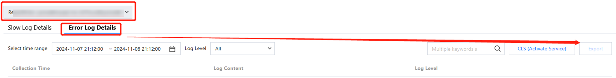3. ターゲットインスタンスを選択し、必要な時間範囲とログレベルをフィルタリングしてから、エクスポートをクリックします。