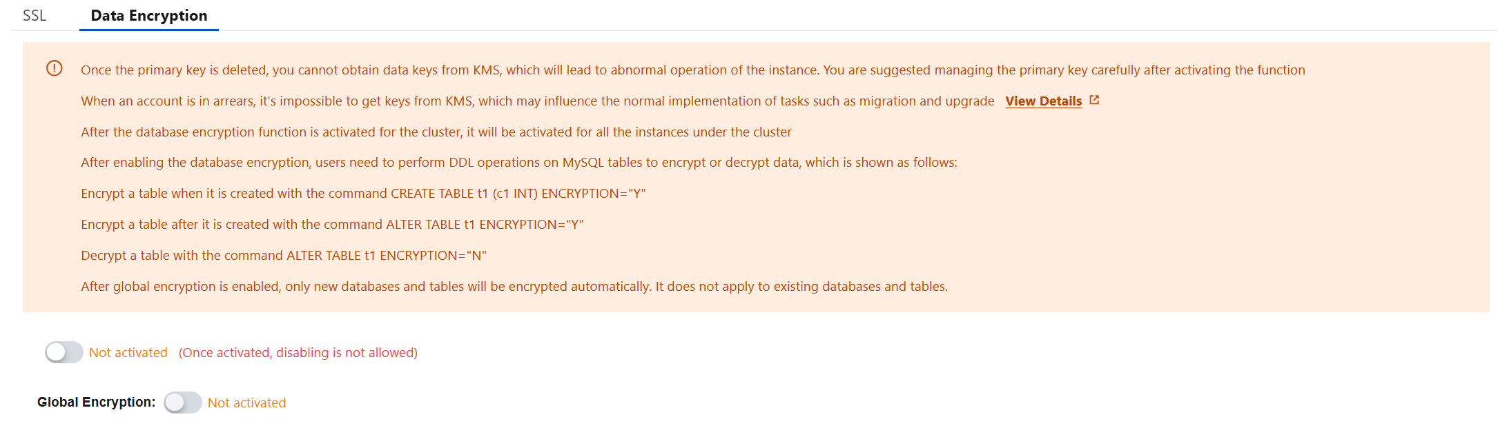 TDE機能を有効化した後、アカウントが未払い状態の場合、KMSからキーを取得できず、移行やアップグレードなどのタスクが正常に進行できなくなる可能性があります。