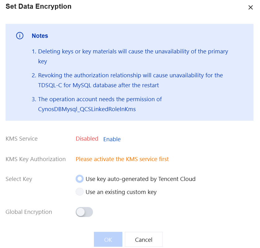 TDE機能を使用するには、キー管理サービスKMSが有効化されている必要があります。有効化されていない場合は、TDEの有効化プロセスでガイドに従ってKMSサービスを有効化できます。 TDE機能を使用するには、KMSキー権限が付与されている必要があります。付与されていない場合は、TDEを有効化するプロセスでガイドに従って権限を付与できます。