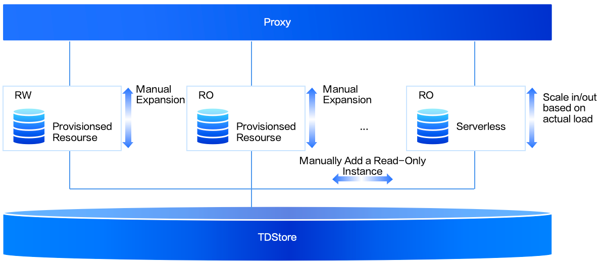 インスタンス形態がServerlessであるインスタンスは、固定スペックを事前に割り当てる必要がなく、実際の使用量に基づいて課金され、ビジネス負荷に応じて自動的にスケーリングされます。これにより、リソースの最大化利用とコストの最適化制御を実現できます。現在、Serverlessのクラスタには1つの読み書きインスタンスが存在します。Serverless単一ノード版の場合、当該クラスタには読み取り専用インスタンスがありません。Serverlessクラスタ版の場合、当該クラスタには1~15個の読み取り専用インスタンスをマウントでき、読み取り専用インスタンスのタイプはServerlessの読み取り専用インスタンスの設定のみをサポートします。