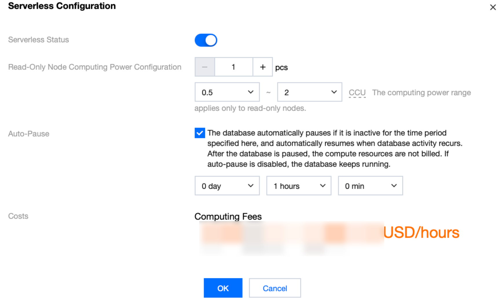 自動一時停止 | 自動一時停止にチェックを入れる場合、自動一時停止時間を設定する必要があります(デフォルトは1時間)。データベースがこの時間内に接続もCPU使用もない場合、自動的に一時停止されます。一時停止後はコンピューティングは課金対象外となりますが、ストレージは引き続き実際の使用量に基づいて課金されます。 自動一時停止にチェックを入れない場合、データベースは継続して稼働し続けます。接続やCPU使用がない場合でも、設定された最小CCUコンピューティング能力に基づいて課金されます。 説明: クラスタがデータベースプロキシを有効化されている場合は、自動一時停止の設定がサポートされていません。 |