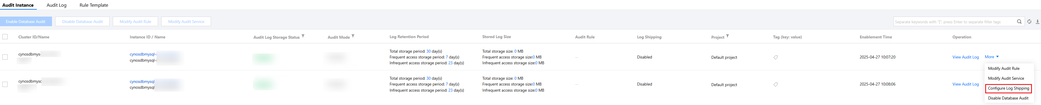 ログ配信を停止すると、現在のインスタンスのデータベース監査ログの配信が停止されます。ご注意ください:停止後は新規ログの配信のみが停止され、既存のログはログトピックに保存され、有効期限まで保持されます。この期間中はストレージ費用が継続して発生します。ログトピックを削除する場合は、ログトピック管理に移動して削除してください。 2. 左側ナビゲーションバーでデータベース監査を選択します。