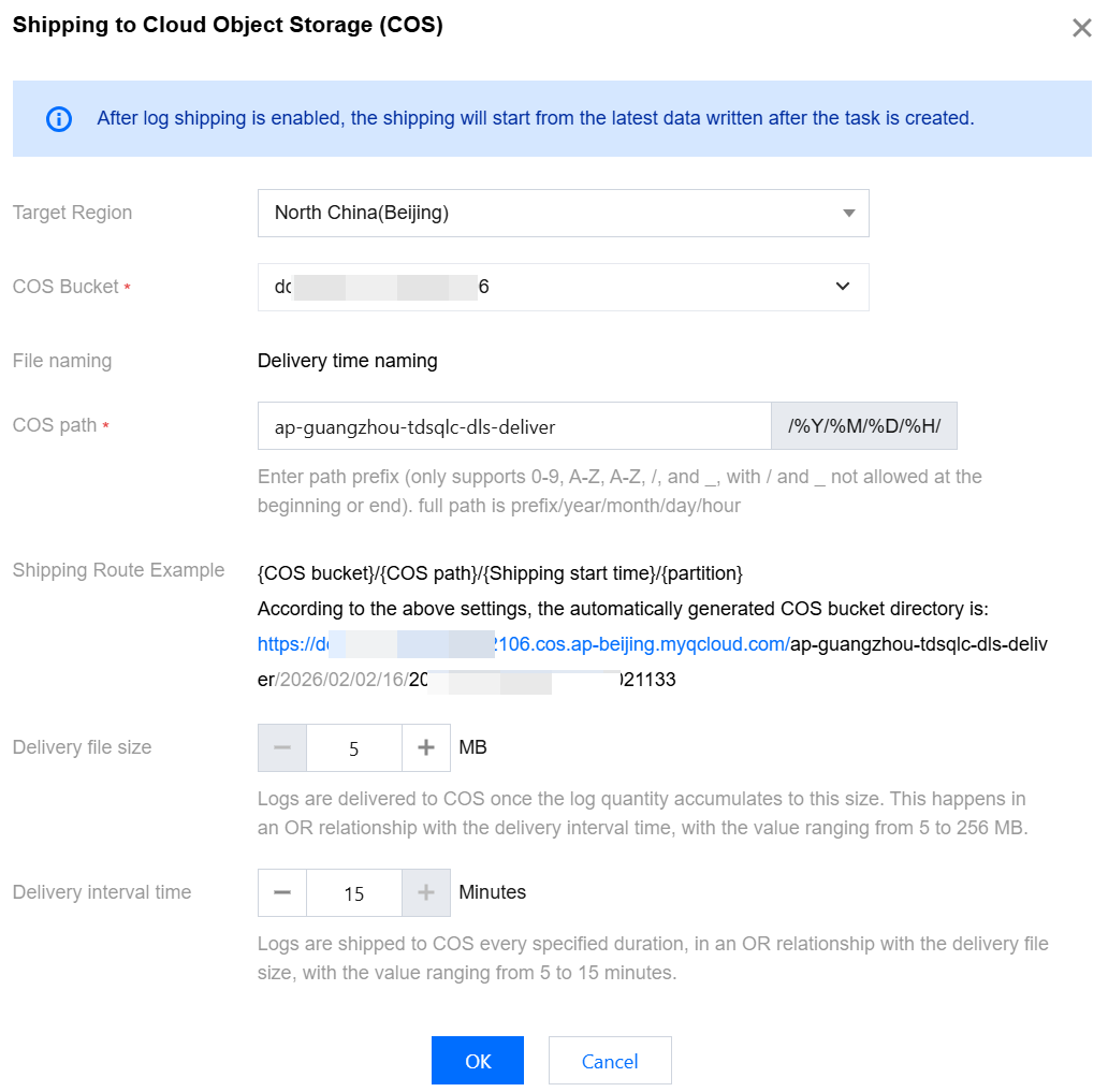ターゲットリージョン | ログ配信のリージョンを選択します。COS側がデータベースインスタンスの所在リージョンをサポートしている場合、この項目はデフォルトでインスタンスの所在リージョンが選択されます。他の選択可能なリージョンを選ぶことも可能です。COS側がデータベースインスタンスの所在リージョンをサポートしていない場合、COSがサポートする他のリージョンを選択できます。 |