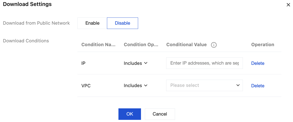 ダウンロード条件 | ダウンロード条件を設定する 条件に対応する条件値が空の場合、その条件を使用して制限しないことを意味します。 IP 条件は IP アドレスを条件値としてサポートし、条件オペレータは含むまたは含まないを選択でき、複数の IP アドレスは日本語の読点「、」で区切ります。 VPC条件は現在のリージョンにあるVPCを条件値としてサポートし、条件オペレータは含むで、複数のVPCを選択できます。 |