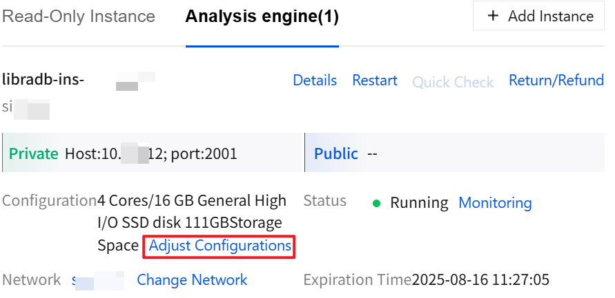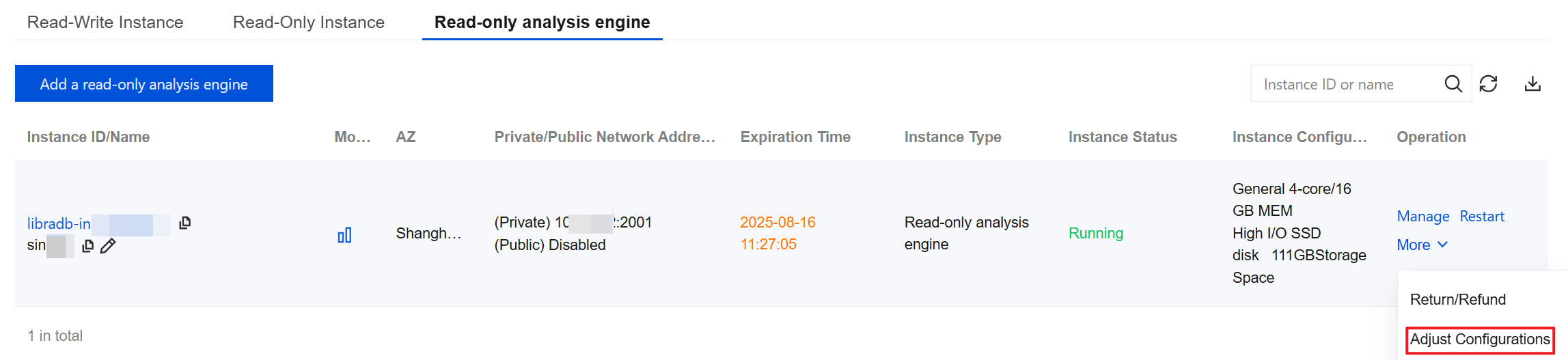 2. クラスタ管理ページで、インスタンスリスト>読み取り専用分析エンジンをクリックし、リストから対象の読み取り専用分析エンジンインスタンスを特定して、その操作列のその他>構成変更をクリックすると、構成変更ページに遷移します。
