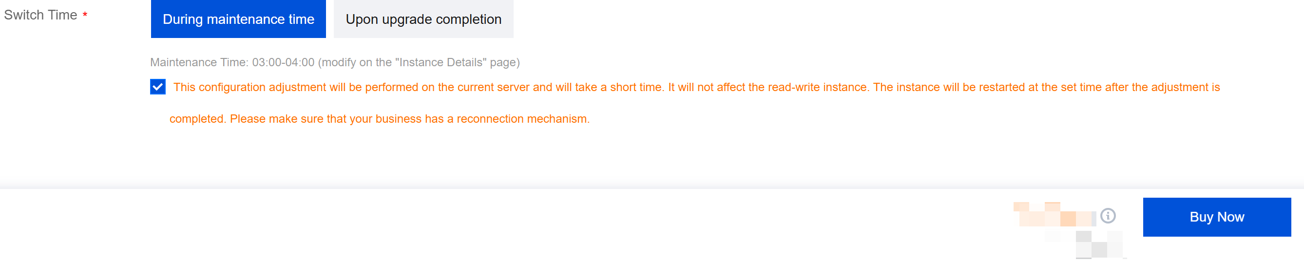 メンテナンス時間内を選択すると、インスタンスのメンテナンス時間内で瞬断切り替えが行われます。インスタンスメンテナンス時間の変更については、インスタンスメンテナンス時間の変更をご参照ください。