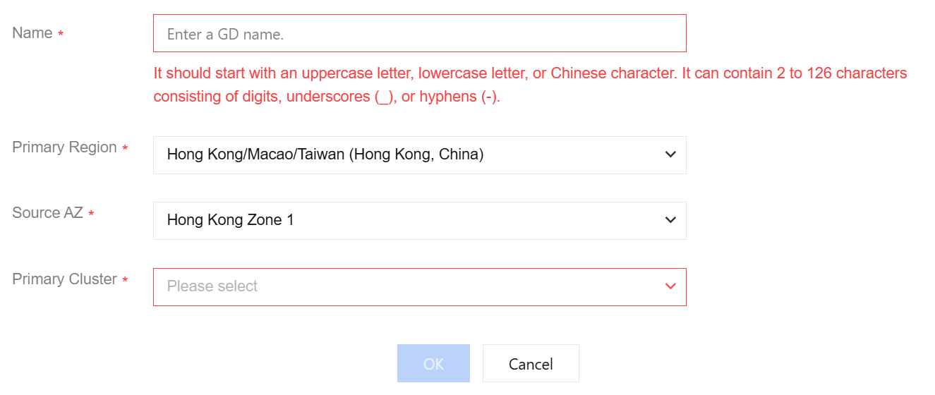 プライマリクラスタ | 既存のクラスタをGDのプライマリクラスタとして選択します。 説明: プライマリクラスタはデータベースプロキシが有効化されている必要があり、かつ読み書きインスタンス仕様が4コア以上である必要があります。 |