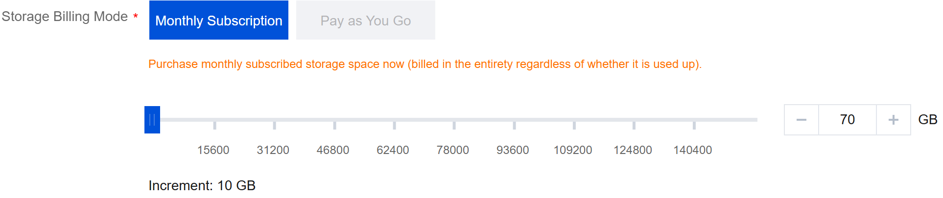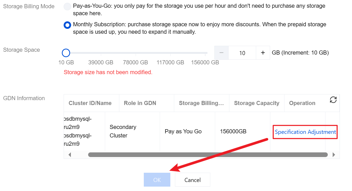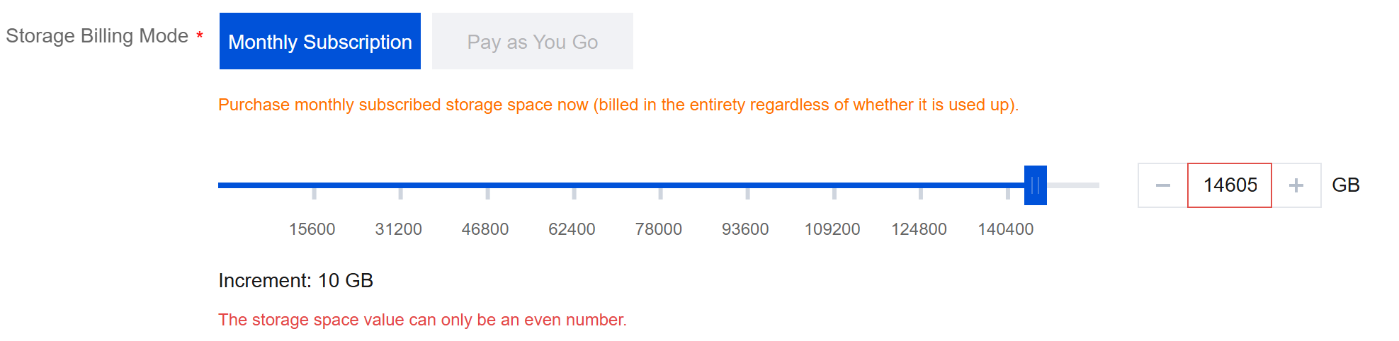 ストレージスペース | ストレージスペースを設定する 選択したインスタンス仕様のストレージスペース上限が、クラスタ内のインスタンス仕様のストレージスペース上限以下である場合、構成変更の操作が可能です。 選択したインスタンス仕様のストレージスペース上限が、スレーブクラスタのインスタンス仕様のストレージスペース上限より大きい場合、構成変更を実行できません。より大きなストレージスペースに調整する必要がある場合は、まずスレーブクラスタのインスタンス仕様をスケールアップし、その後でマスタークラスタのインスタンス仕様を調整する必要があります。インスタンス仕様と対応するストレージスペース上限のデータについては、製品仕様を参照してください。 ![]() |
