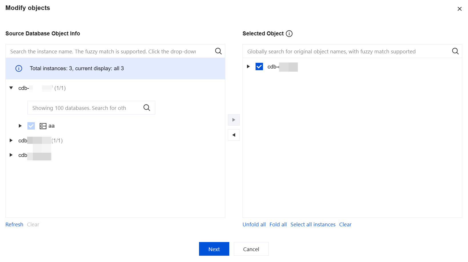 4. インスタンス詳細ページで変更オブジェクトをクリックし、変更オブジェクトポップアップでターゲットデータベースまたはテーブルにチェックを入れ、次へをクリックします。