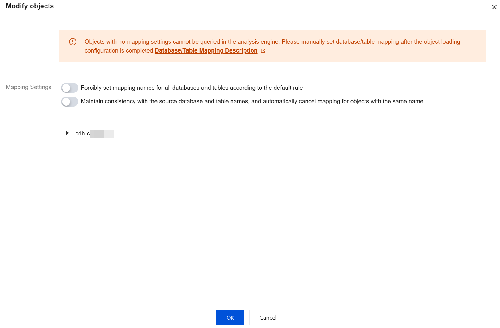 マッピング設定では、「デフォルトルールに基づきすべてのデータベース/テーブルのマッピング名を強制的に設定」または「ソース側のデータベース/テーブル名と一致させ、重複オブジェクトは自動的にマッピング解除」を選択できます。あるいは、一時的に選択をスキップすることも可能です。ただし、マッピングが設定されていないオブジェクトは分析エンジンでクエリを実行できないことにご注意ください。