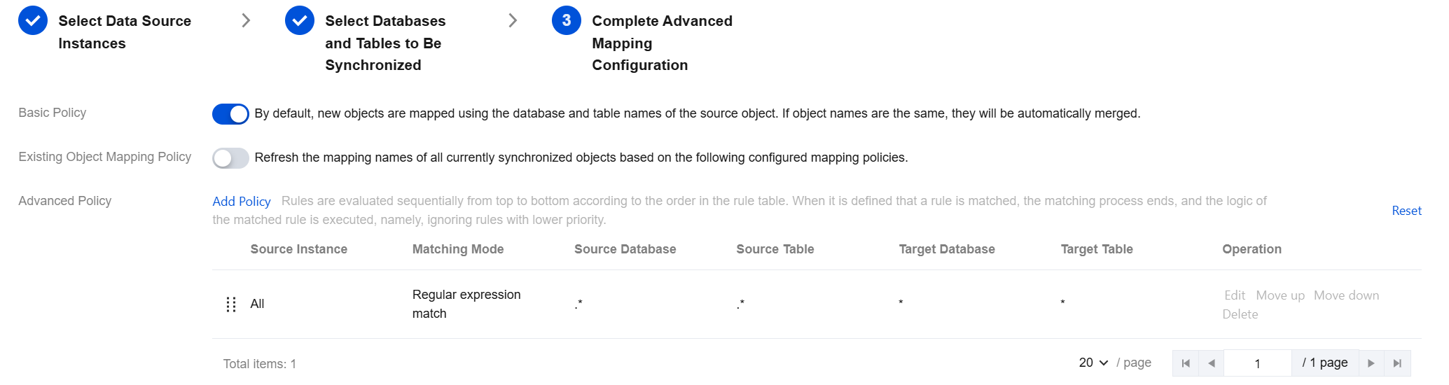 デフォルトの基本ポリシーは有効状態であり、有効化された基本ポリシーは下部のポリシーテーブルの先頭行に新しいポリシー情報を追加します。ルールとして、分析クラスターに同期されるすべてのオブジェクトは元のデータベース名とテーブル名でマッピングされます。データベース名とテーブル名が同じテーブルが存在する場合、自動的に統合されます。テーブル構造が不一致の場合、クエリ時にエラーが発生します。指定したインスタンスのデータベース/テーブルを他の名前にマッピングさせるため、手動で他のアドバンストポリシーを追加することができます。