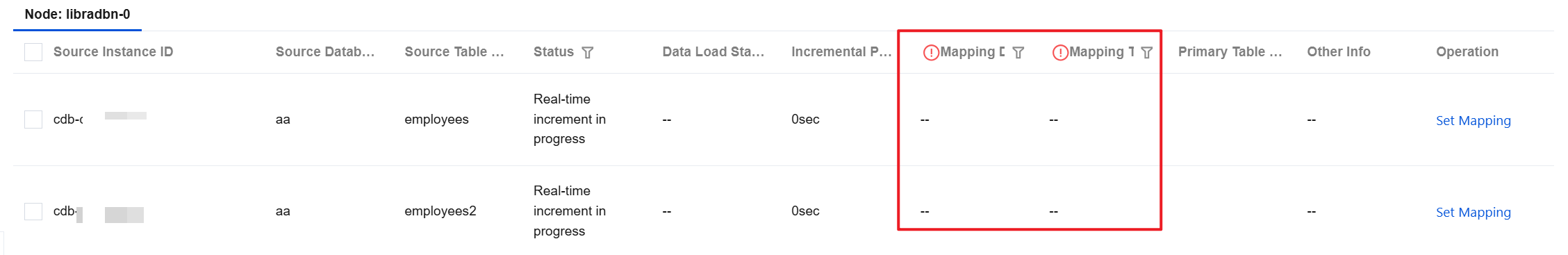 ソース側のデータベース・テーブル名と一致させ、重複オブジェクトは自動的にマッピング解除:同期リストに追加されたオブジェクトのマッピング名をソース側のデータベース・テーブル名と同じに設定します。ただし、マルチソースデータマージシナリオではデータベース・テーブル名が重複する可能性があり、この問題が発生した場合、重複したデータベース・テーブルのマッピング名は空になります。後で手動でデータベース・テーブルマッピングを設定する必要があります。