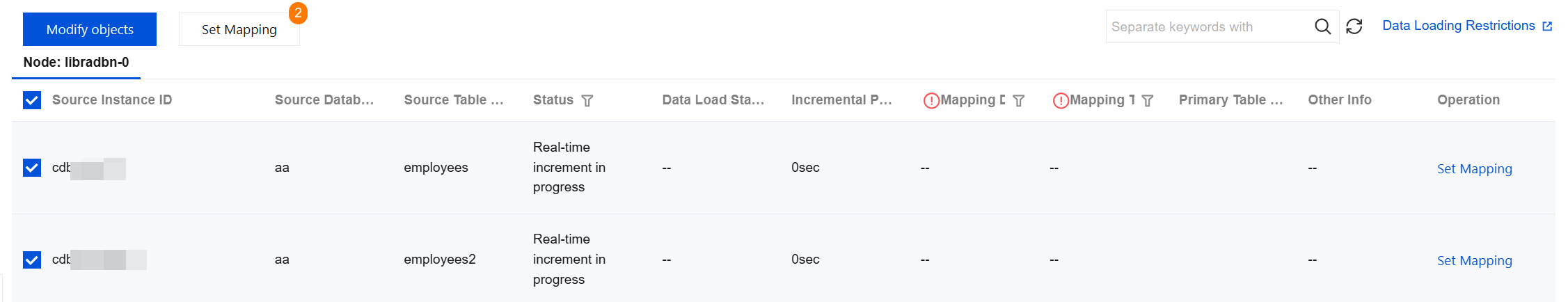 設定されていないテーブルマッピングのオブジェクトは、分析エンジンでクエリを実行できません。したがって、オブジェクトのロード設定が完了した後、手動でテーブルマッピングを設定する必要があります。