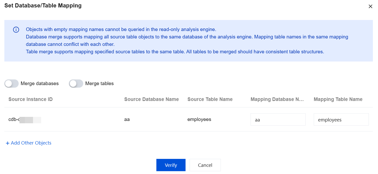 分析クラスタでは、すべてのオブジェクトはTDSQL-C for MySQL分析クラスタによってソースデータベースから自動的に同期されます。ただし、分析クラスタに同期されたオブジェクトは、マッピング名を使用してテーブルオブジェクトのデータを参照する必要があります。マッピング名は変更をサポートしており、例えばソース側のデータベース/テーブル名が「db1.ta2」の場合、分析クラスタに同期後は「db3.ta3」という名前に設定できます。