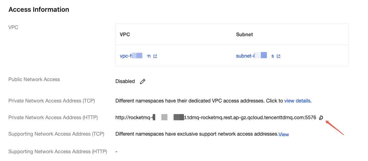 nameserver | Cluster access address. You can obtain the access address from the Access Information module on the Cluster Basic Information page in the console. ![]() |