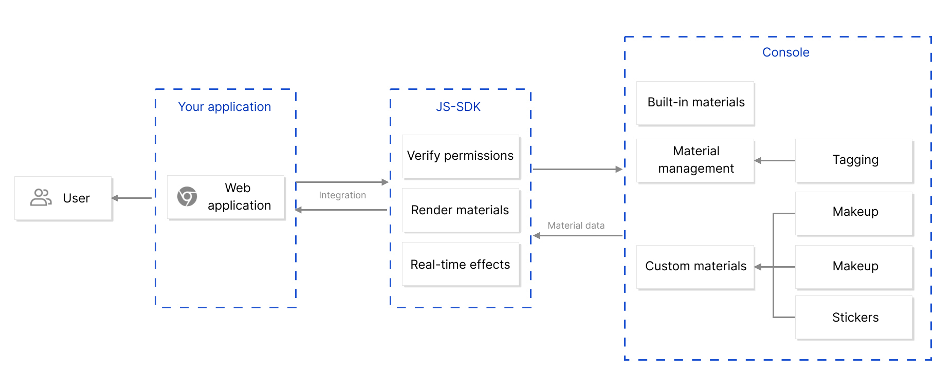 この製品の SDK および素材制作管理ツールを使用すると、AI 美顔、フィルタリング、メイクアップ、ステッカー、Animoji 表情、バーチャルキャラクターなどの AR 効果を、PC Web、モバイル Web ページに手軽に追加することができます。 ビジネス版