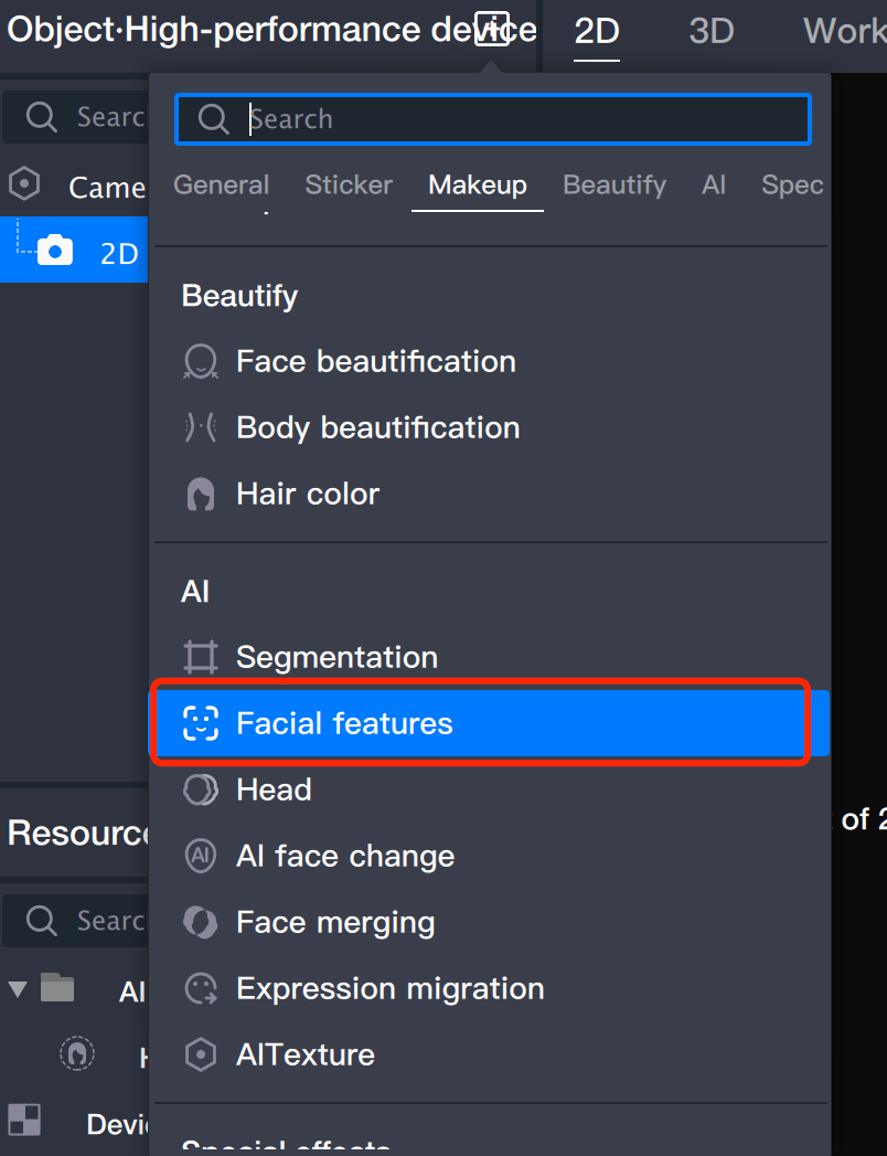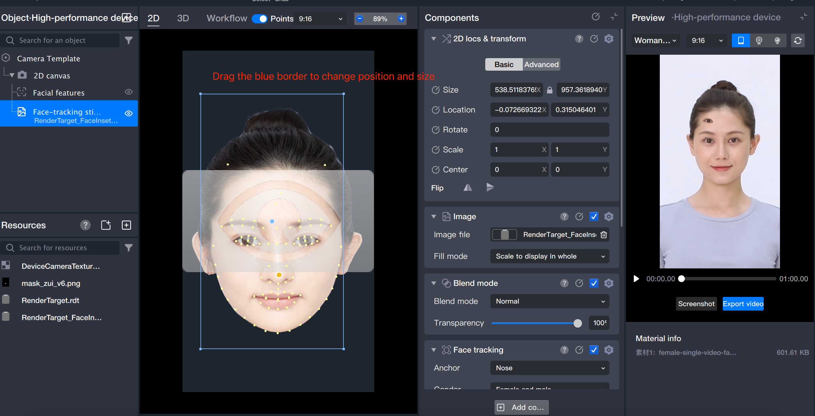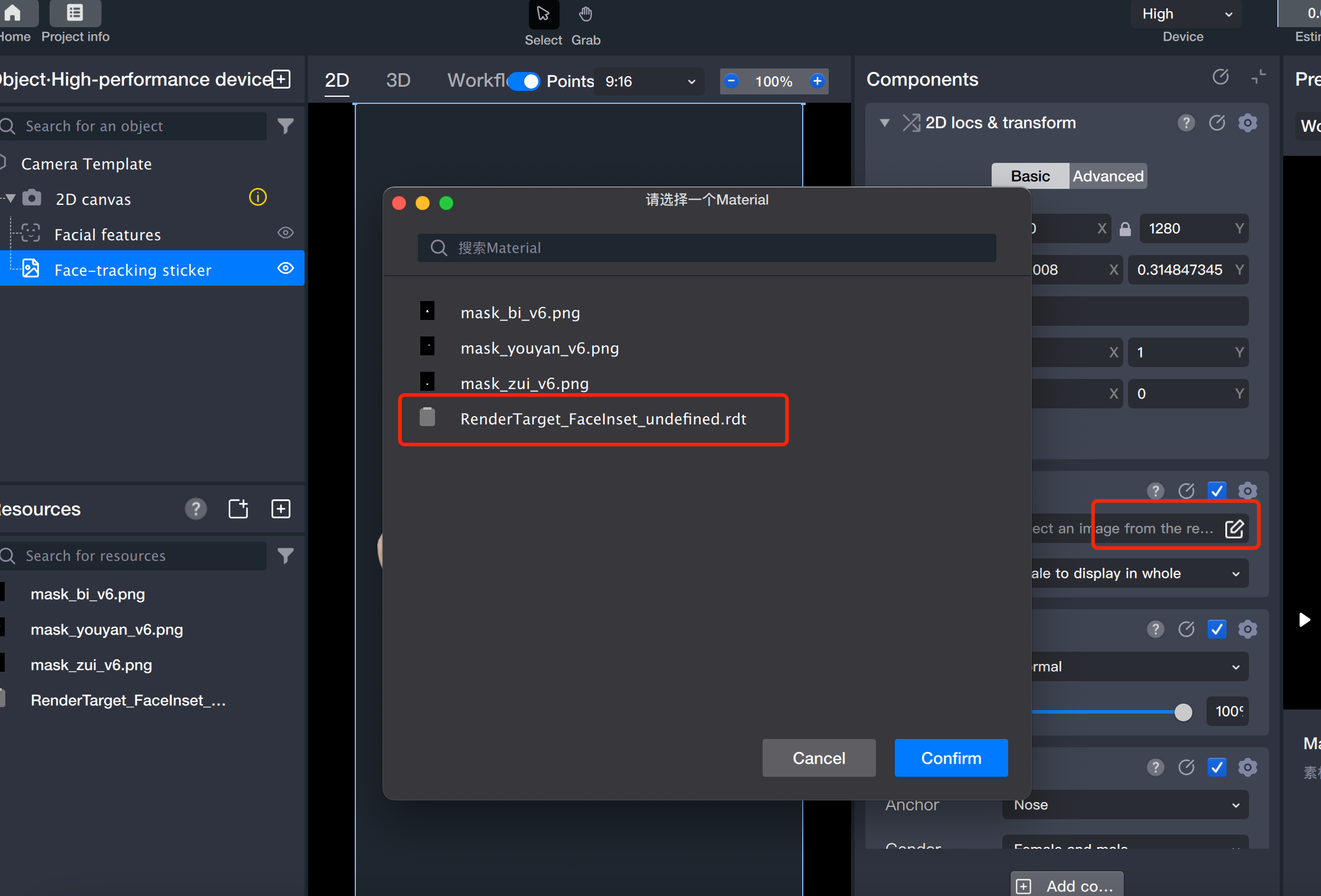 2. 五官選択機能を追加すると、リソースパネルに RenderTarget_FaceInset1.rdt ファイルが表示されます。このファイルは分割機能によって生成される出力ファイルであり、抽出された五官の画像が保存されます(後でステッカーとして使用可能です)。
