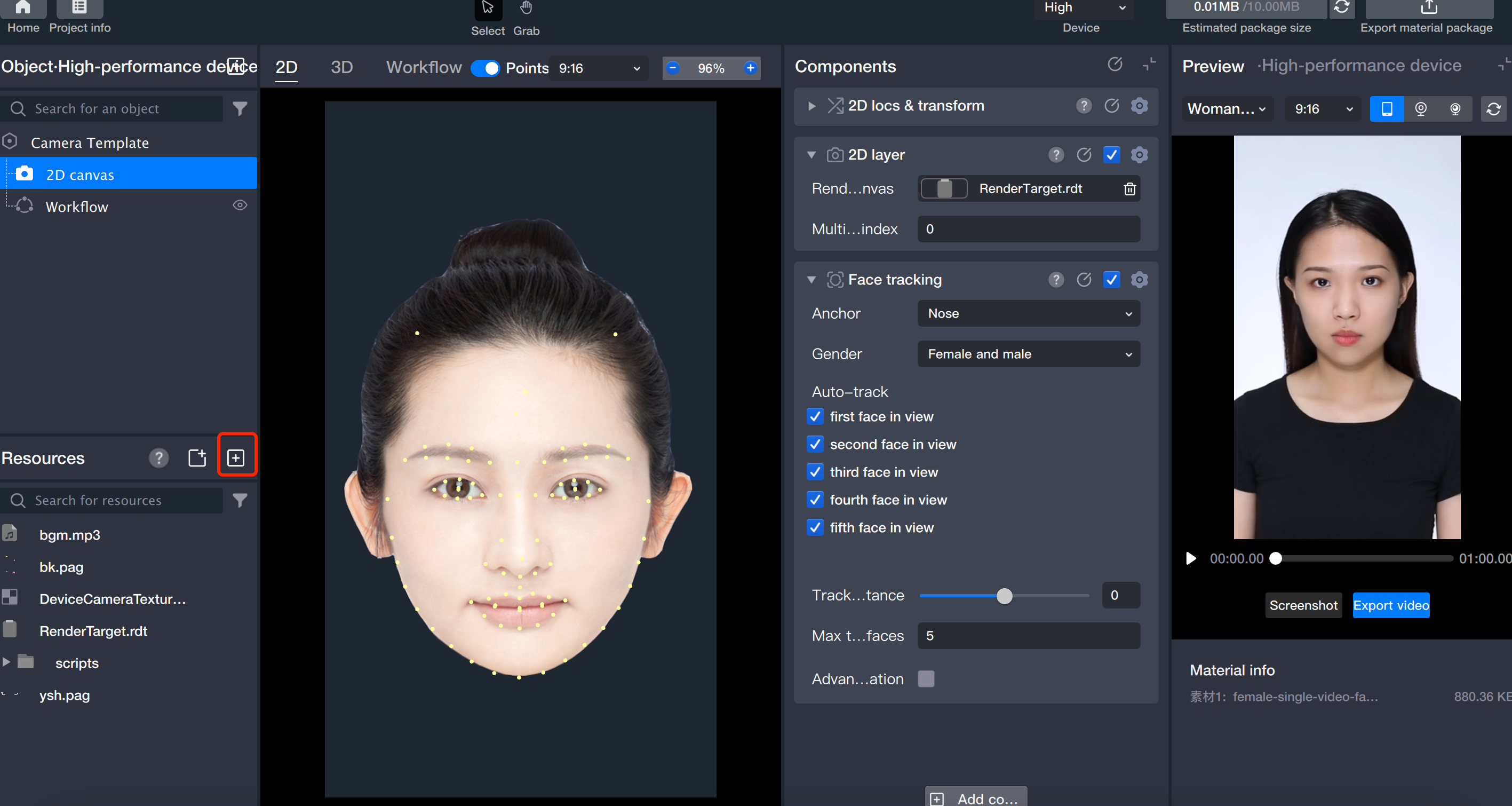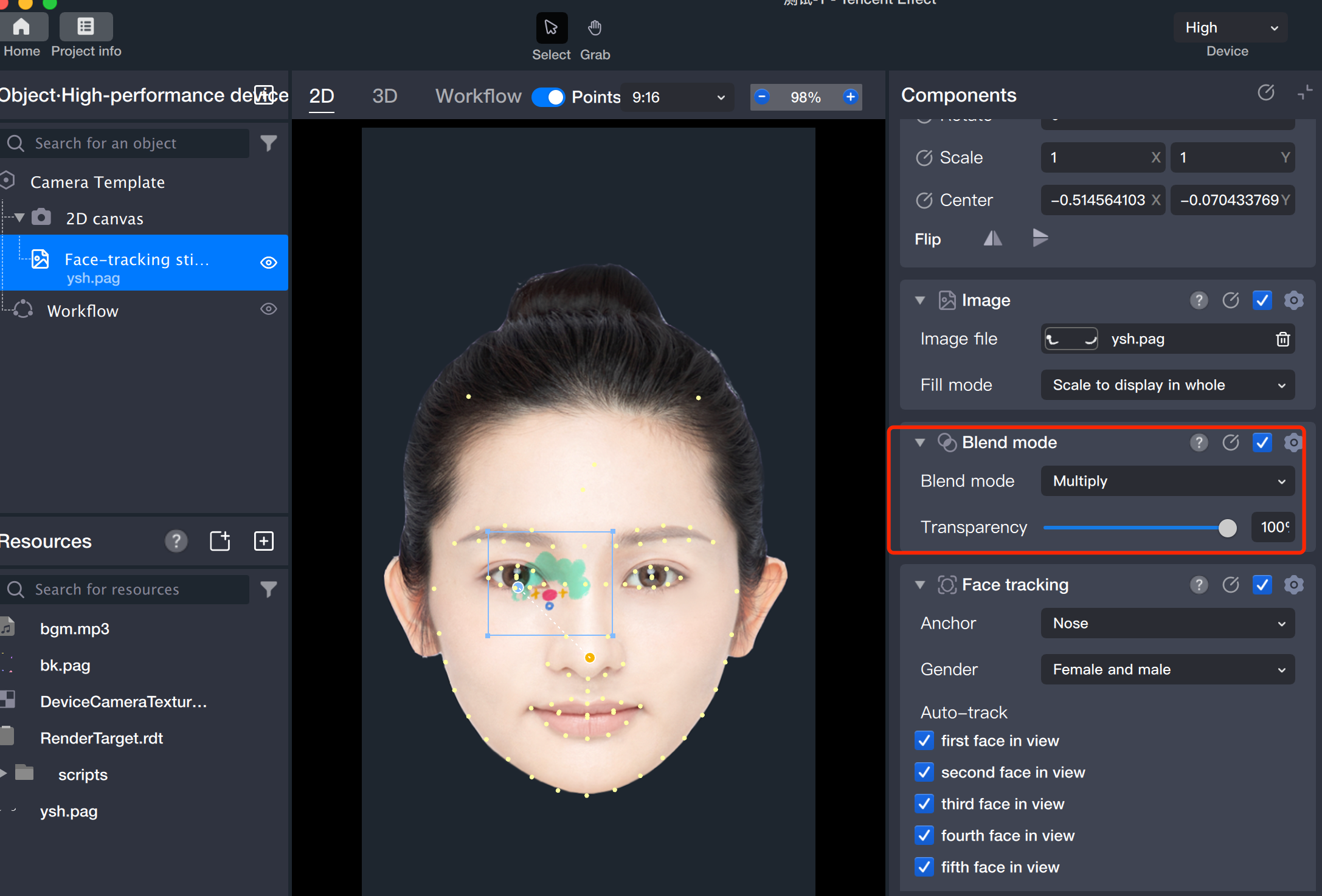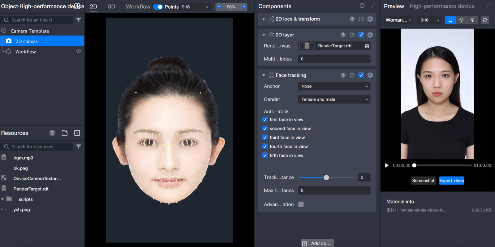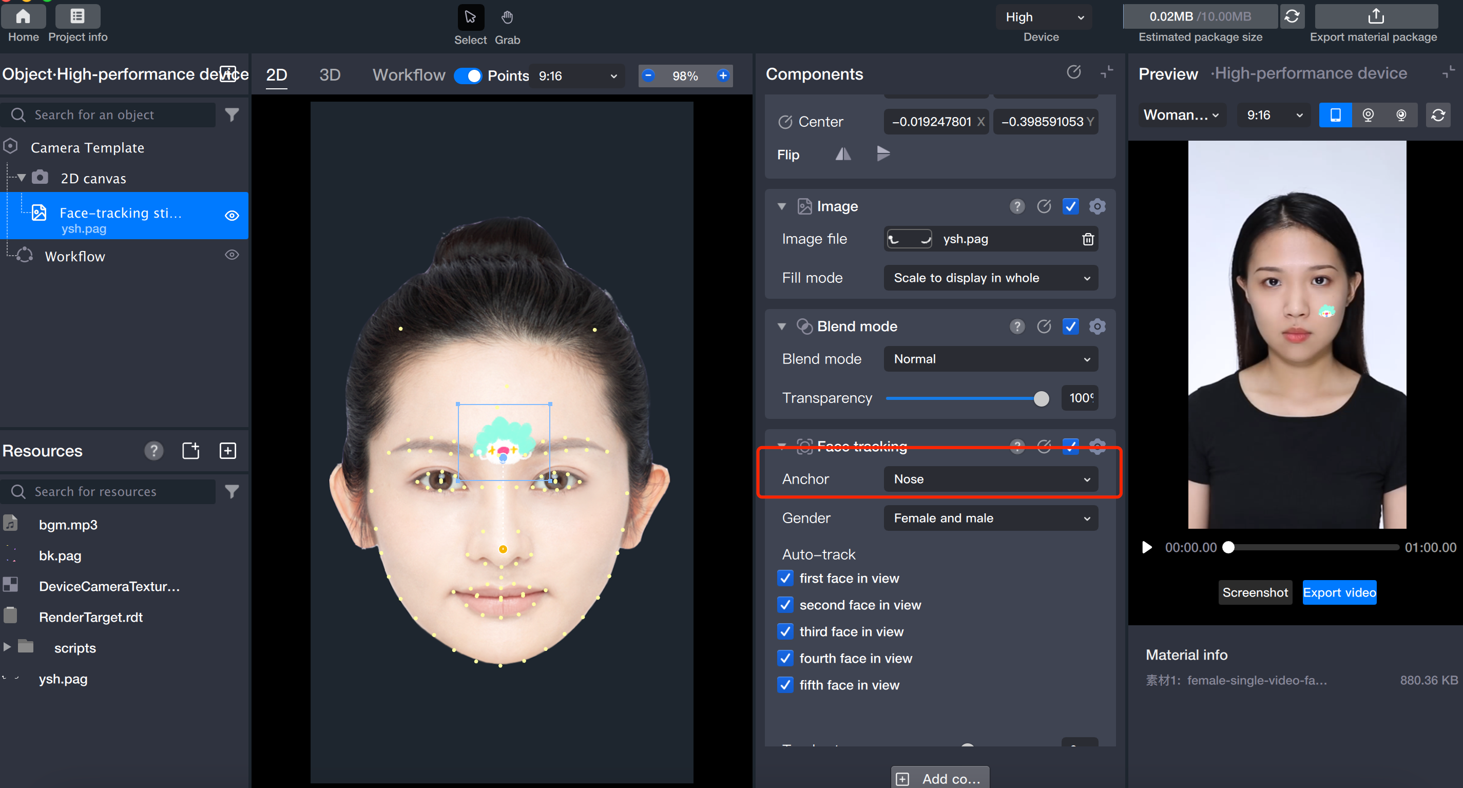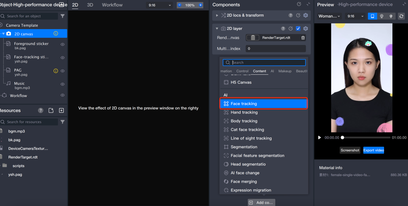 フォローコンポーネントを使用すると、2D画像やpagファイルなどの素材を、画面上の特定オブジェクトに追加できます。Tencent Effectは現在、顔、ジェスチャー、身体、猫の顔のトラッキングに対応しています。本ガイドでは顔トラッキングの使用方法を例示しますが、他のトラッキング機能も同様の手順で設定可能です。