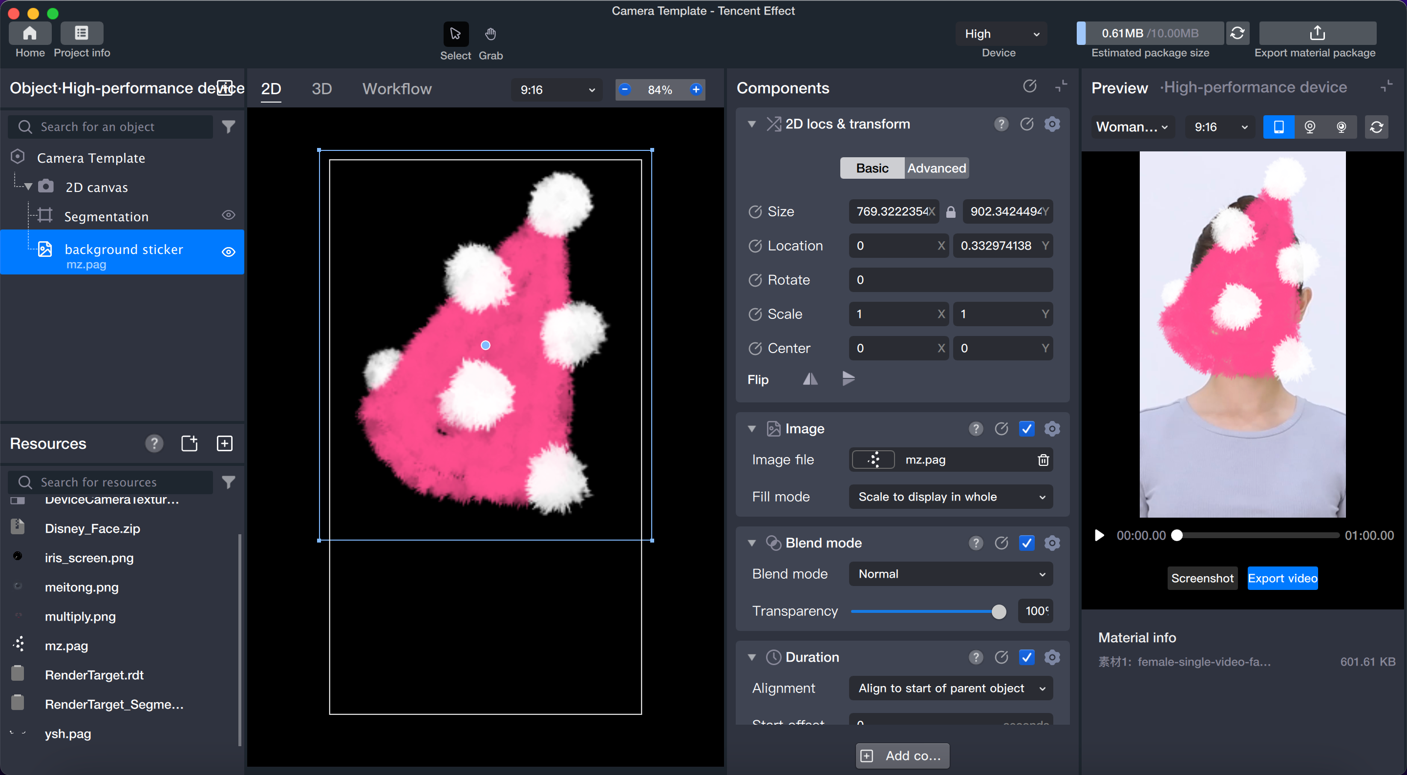 リソースパネルでpagアニメーションを背景素材としてインポートします。png画像も背景素材として使用可能です。
