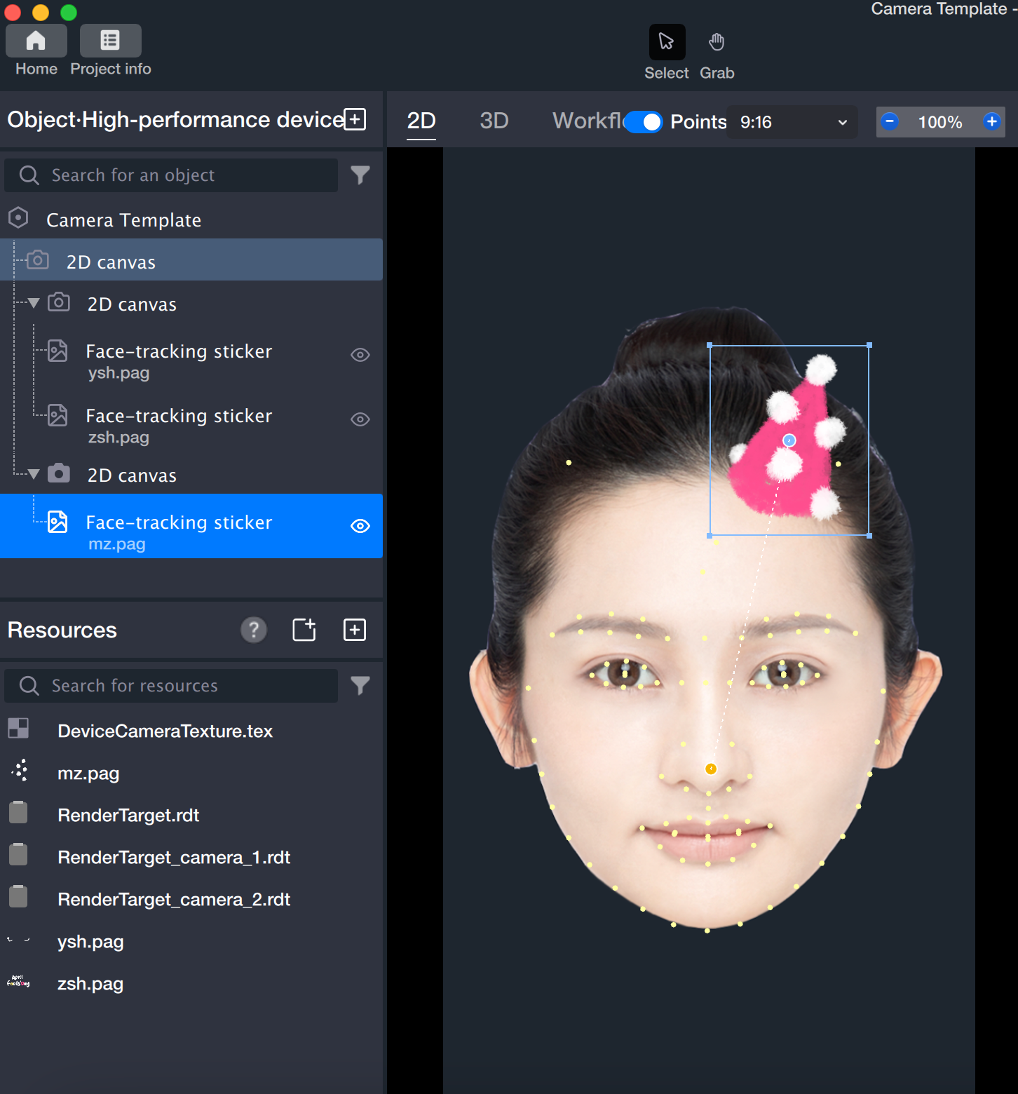 3. 2つの2Dアートボードそれぞれに顔追従スタンプを配置し、効果を確認します。
