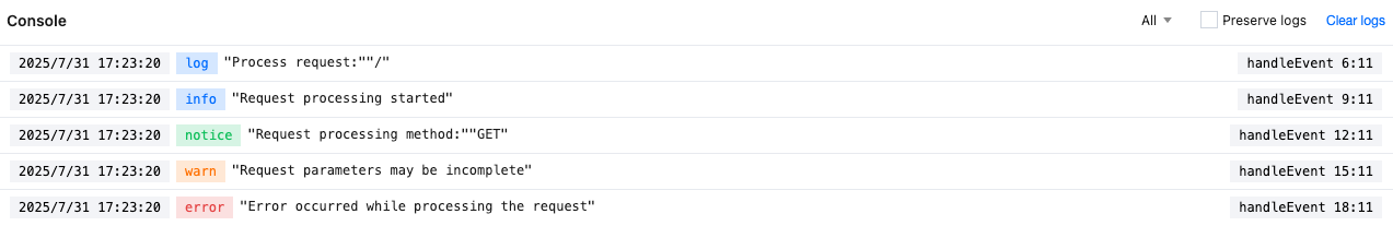 console can be retained and analyzed through the real-time log push feature for long-term log retention and query analysis.console supports four levels: info, notice, warn, and error. console.log() corresponds to the info level.console output content size limit is 4KB. Exceeding the limit will result in truncation.console content length to 8k characters.console outputs per request. Any console output exceeding 20 will not be shown on the debugging page.function handleEvent(event) {const { request } = event;const url = new URL(request.url);// Output basic informationconsole.log('Process request:', url.pathname);// Output prompt messageconsole.info('Request processing started');// Output attention informationconsole.notice('Request processing method:', request.method);// Output warning informationconsole.warn('Request parameters may be incomplete');// Output error informationconsole.error('Error occurred while processing the request');return event.respondWith(new Response('Hello World'));}addEventListener('fetch', event => {handleEvent(event);});