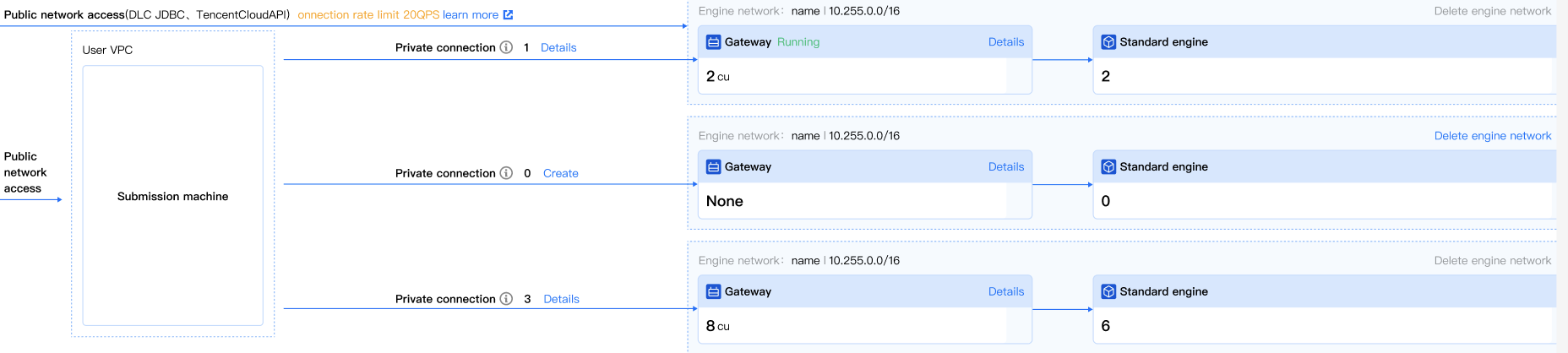 ホワイトリストが有効になっていない場合、ユーザーはデフォルトで1つのエンジンネットワークを持っています。ユーザーが手動でゲートウェイを作成する必要はなく、ユーザーがこのエンジンネットワークで最初のエンジンを作成するか、最初のタスクを送信するときに、DLCはデフォルトでこのエンジンネットワークに2CU仕様の無料ゲートウェイを作成します。