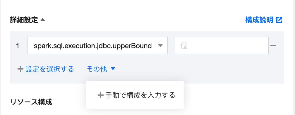 図のように、データ探索ページで、データエンジンに標準Sparkエンジンを選択し、リソース構成でリソースグループを選択し、ページ上で「詳細設定」を選択すると、設定を追加できます。