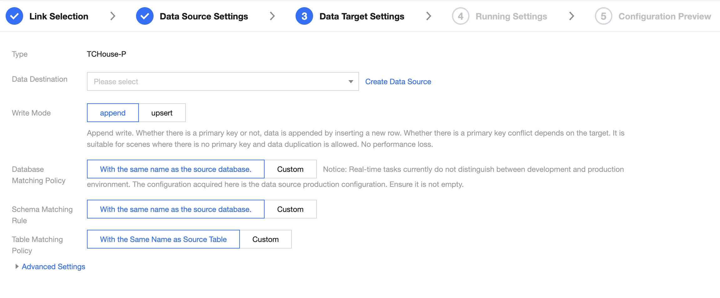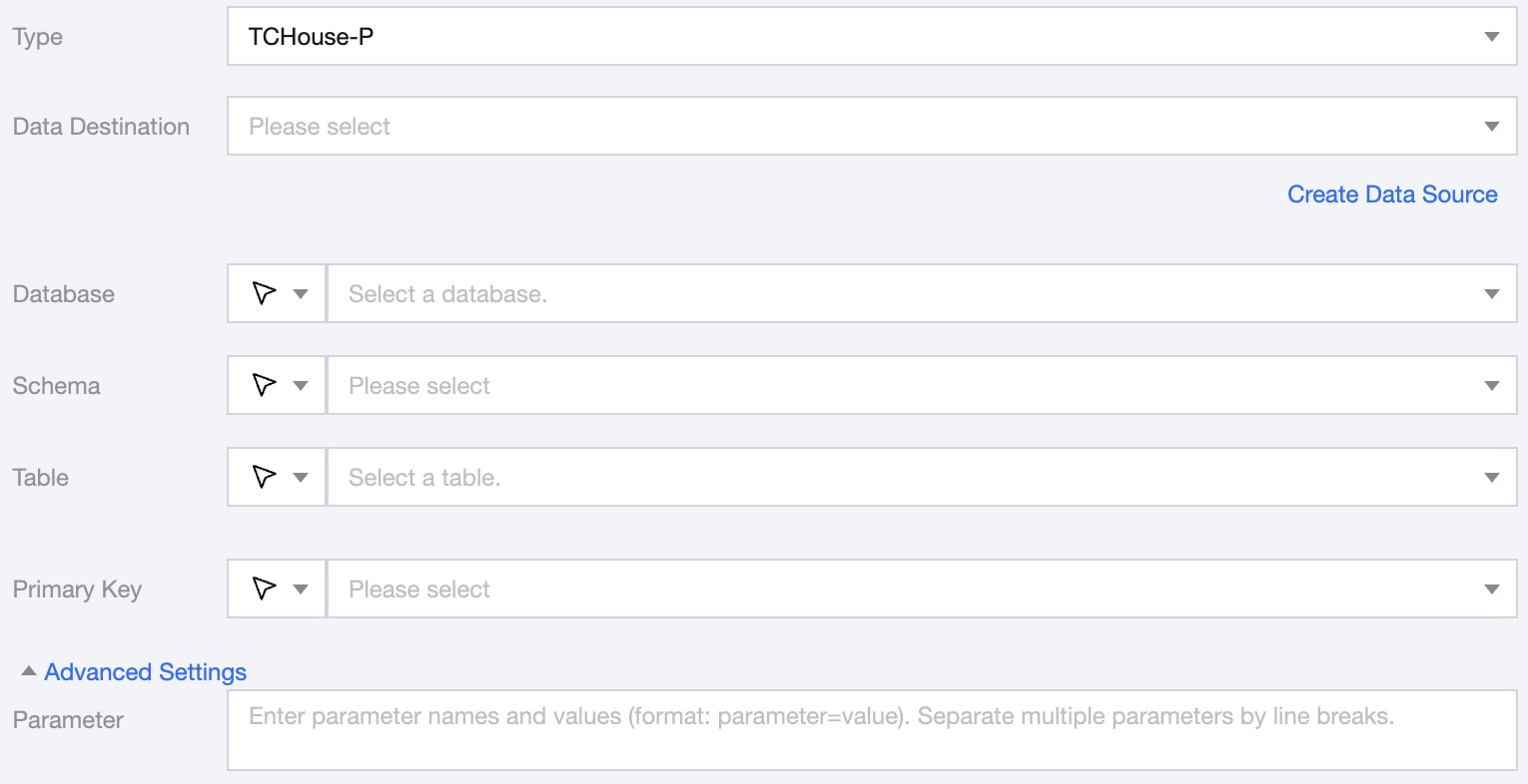 Create Target Table with One Click | When the source end is MySQL, TDSQL-C MySQL, TDSQL MySQL, Oracle, PostgreSQL, Oceanbase, or Dameng, it supports quickly creating TCHouse-P target tables through the source table structure |