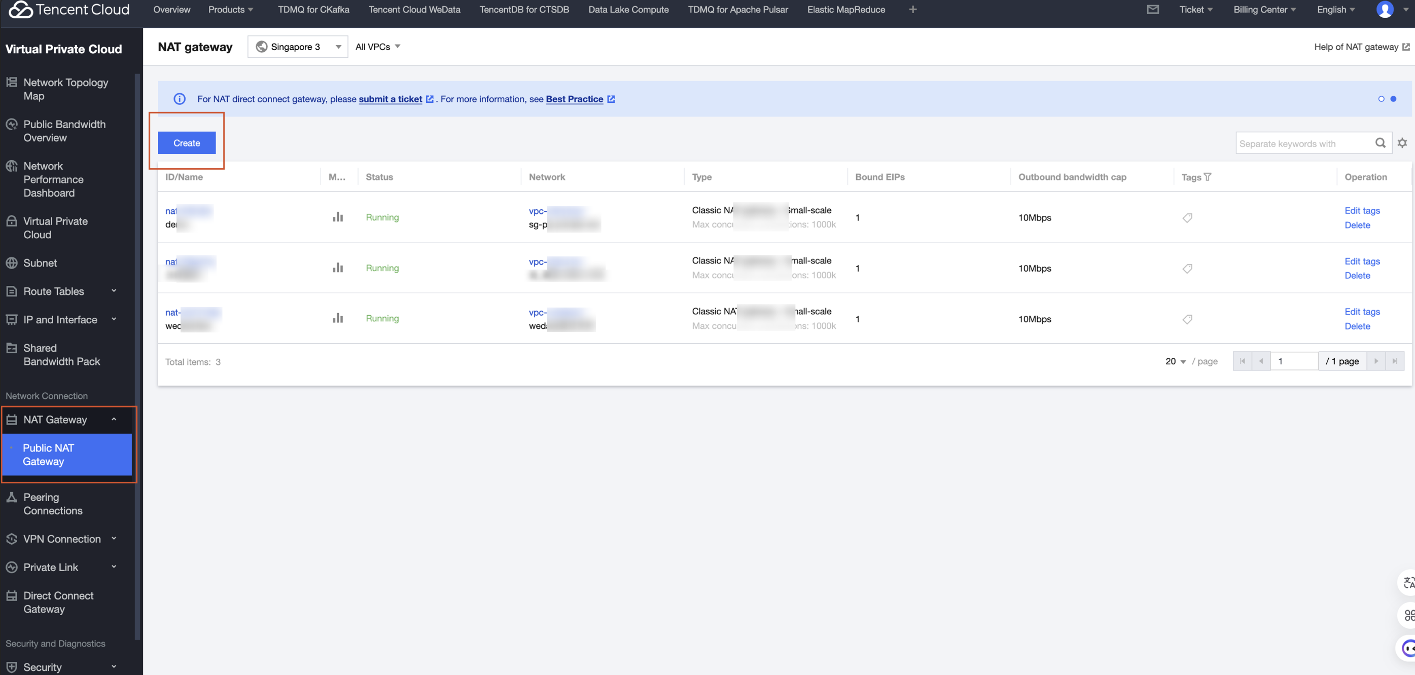 1. Go to Virtual Private Cloud > NAT Gateway. In the corresponding region, click Create NAT Gateway.