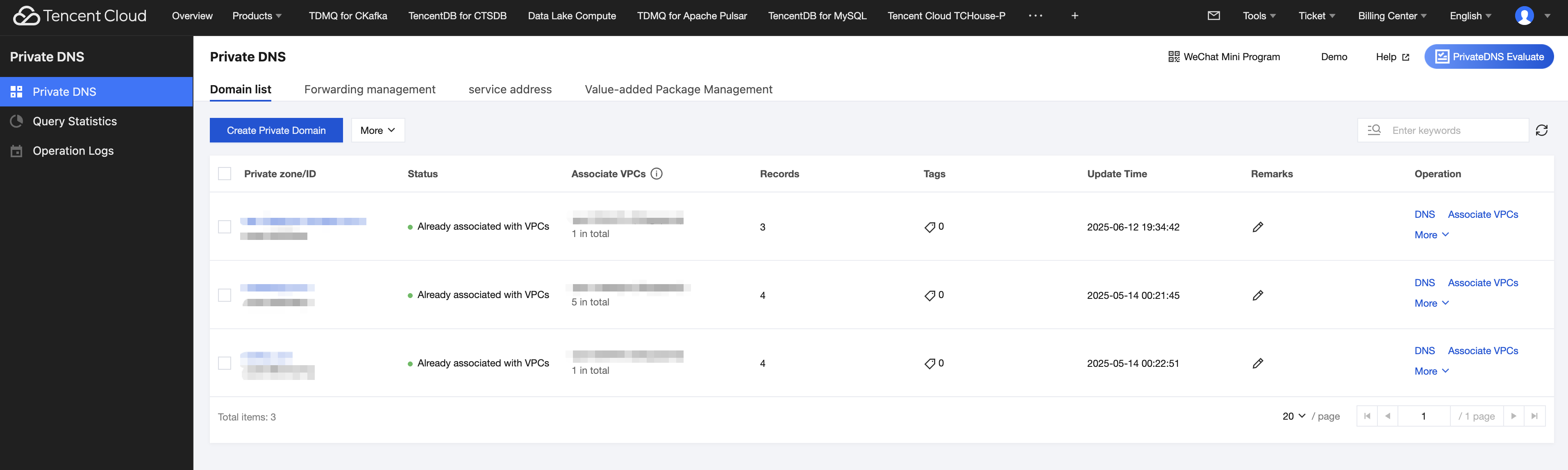 1. Enter Tencent Cloud DNS product and add resolution records for the private domain in Private DNS.