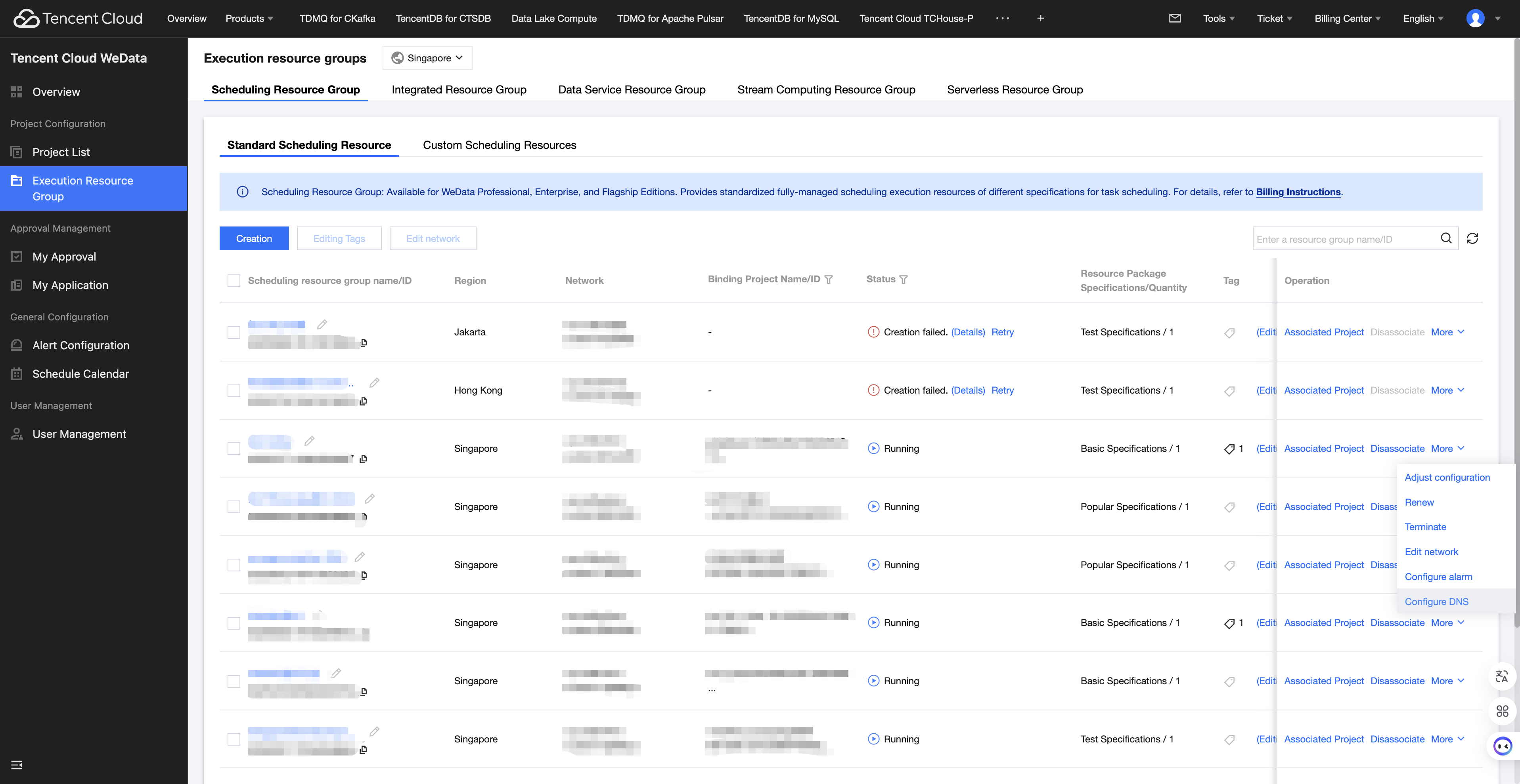 2. Enter WeData Console > execution resource group, click operate > more > configure DNS.